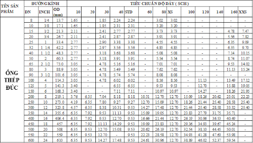 Bảng quy cách tiêu chuẩn của thép ống đúc ASTM A106