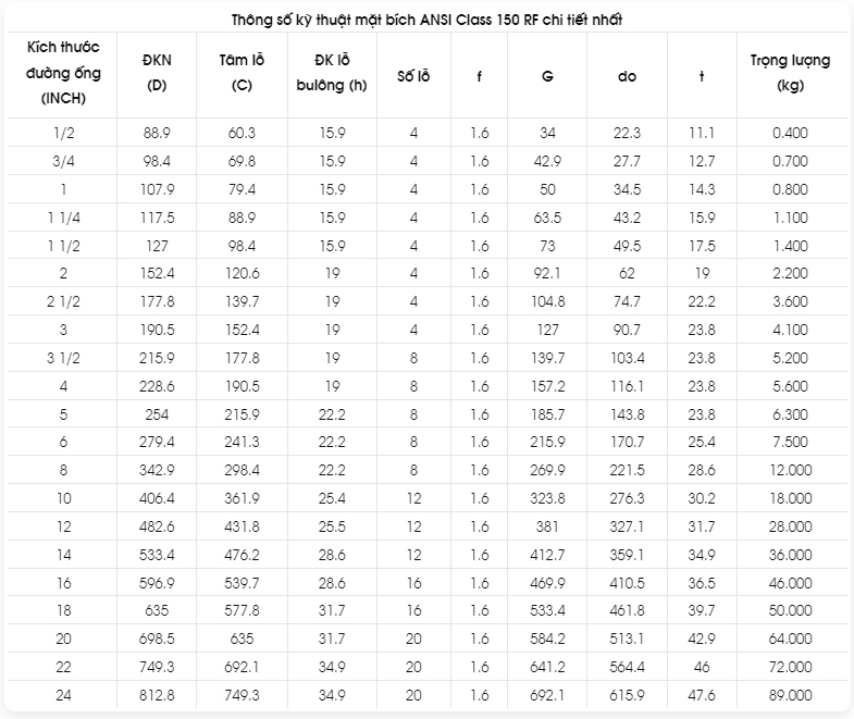 Bảng thông số kỹ thuật mặt bích ANSI class 150
