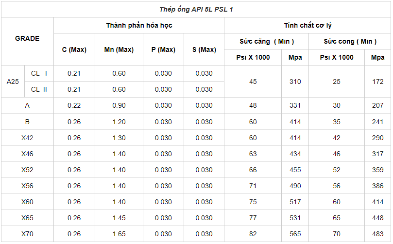 Thành phần hóa học Thép ống đúc API 5L PSL1