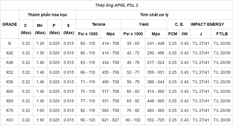 Thành phần hóa học của Thép ống đúc tiêu chuẩn API 5L