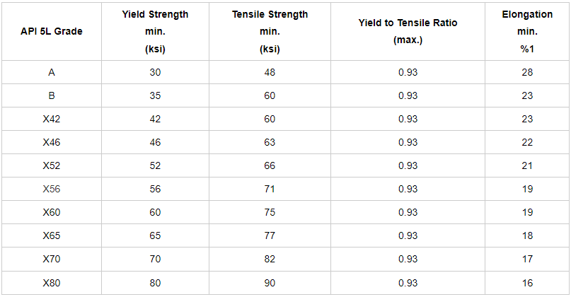 Việc phân chia lớp thép theo Tiêu chuẩn thép ống API 5L cho đường ống. Phân chia thành 2 lớp A và B. Lớp thép cường lực có ký hiệu X với sức cong tối thiếu của ống, được tính kilopound trên mỗi inch vuông (được viết tắt Ksi). Ví dụ, X60 có sức cong tối thiểu 60 ksi.