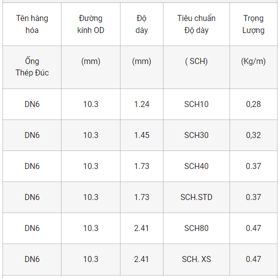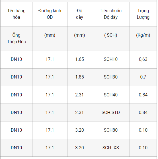 Quy cách ống thép đúc c45 DN10 – Phi 17