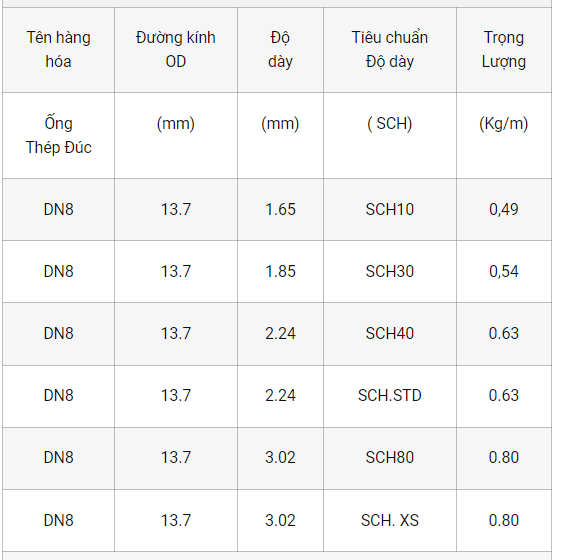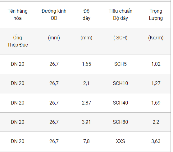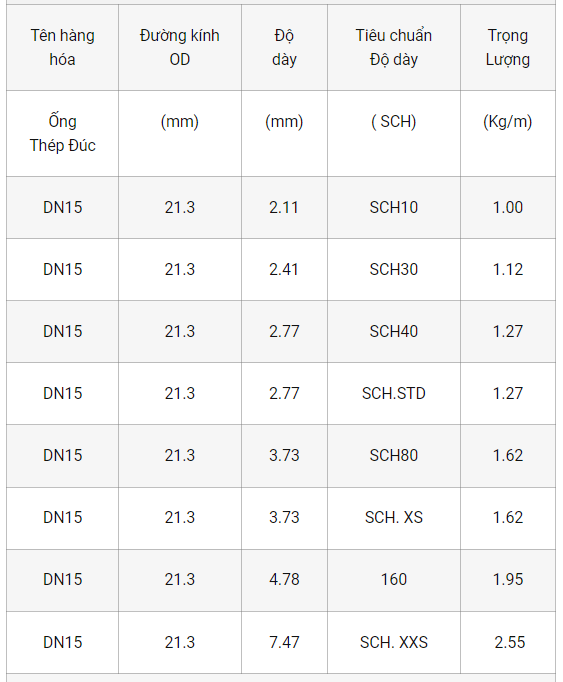 Quy cách ống thép đúc c45 DN15 – Phi 21