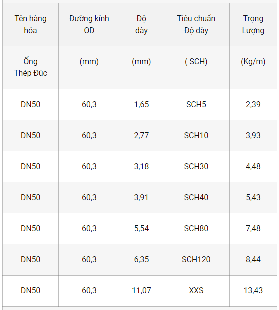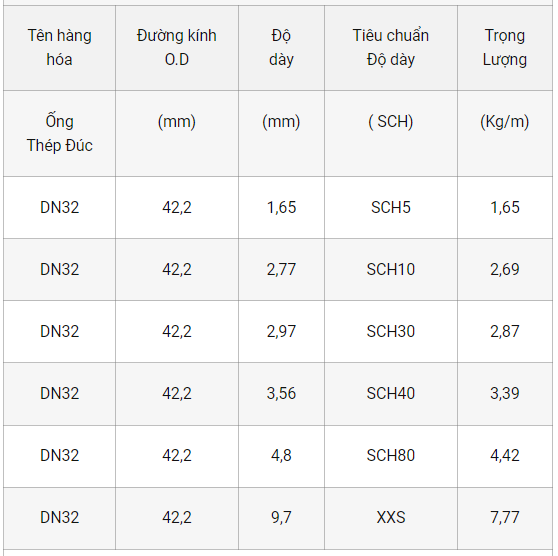 Quy cách ống thép đúc C45 DN40 – Phi 48.3