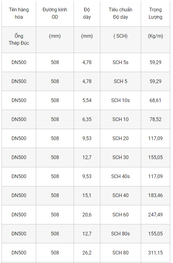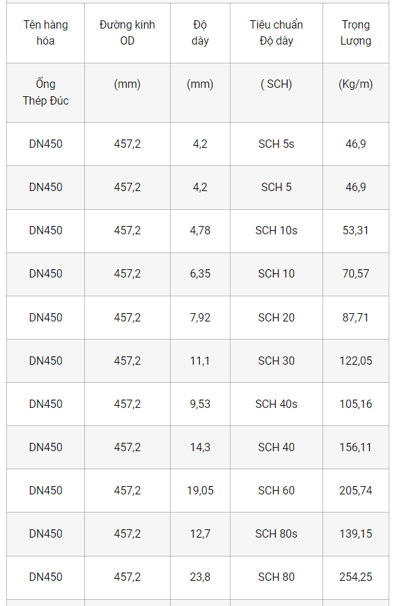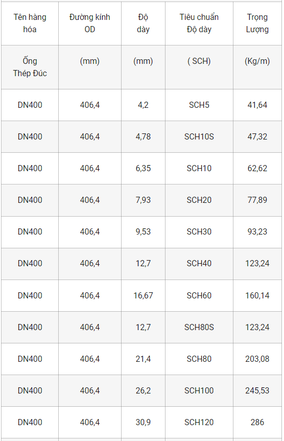 Quy cách ống thép đúc c45 DN400 – phi 406
