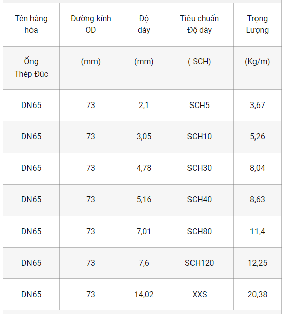 Quy cách ống thép đúc C45 DN65 – Phi 73