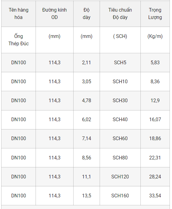 Quy cách ống thép đúc C45 DN100 – Phi 114