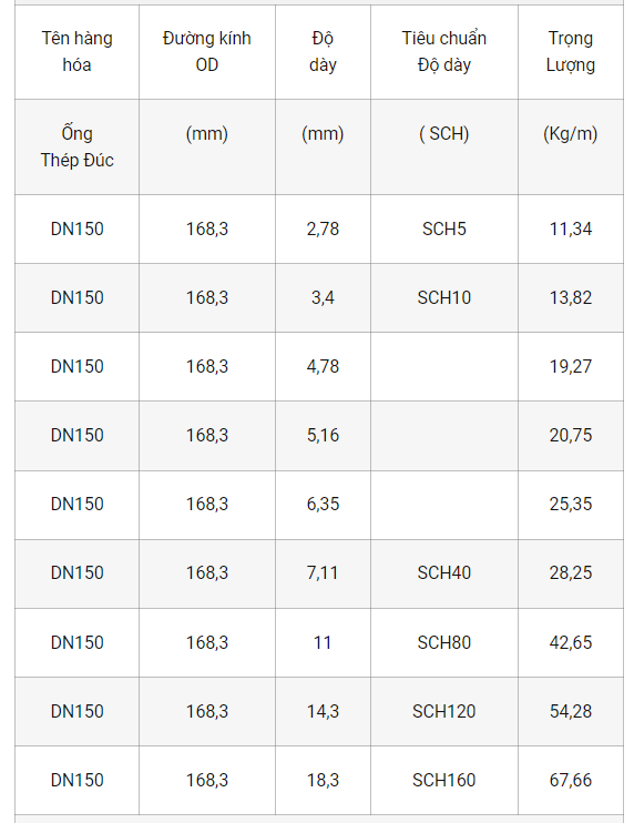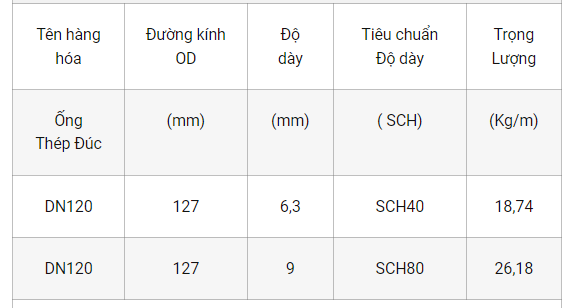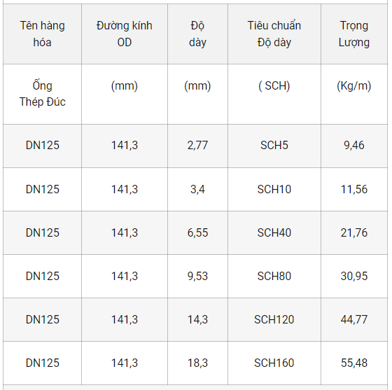 Quy cách ống thép đúc c45 DN125 – Phi 141