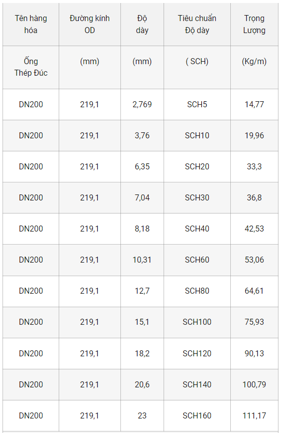 Quy cách ống thép đúc c45 DN200 – Phi 219