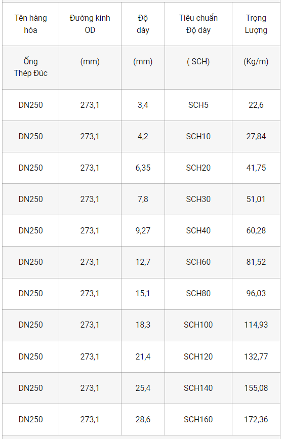 Quy cách ống thép đúc c45 DN250 Phi 273