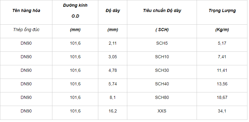 Quy cách tiêu chuẩn ống thép đúc DN100 – Phi 114,3mm được thể hiện dựa trên các thông số như : Đường kính (mm) , Độ dày (mm), Tiêu chuẩn độ dày (SCH), Trọng lượng theo Barem (Kg/m).
