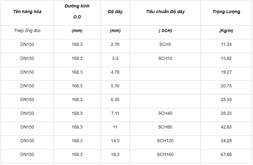 Quy cách tiêu chuẩn ống thép đúc DN150 – Phi 168,3mm được thể hiện dựa trên các thông số như : Đường kính (mm) , Độ dày (mm), Tiêu chuẩn độ dày (SCH), Trọng lượng theo Barem (Kg/m).