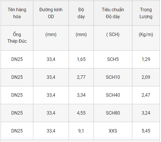 Quy cách tiêu chuẩn ống thép đúc DN25 – Phi 33.4 được thể hiện dựa trên các thông số như : Đường kính (mm) , Độ dày (mm), Tiêu chuẩn độ dày (SCH), Trọng lượng theo Barem (Kg/m).
