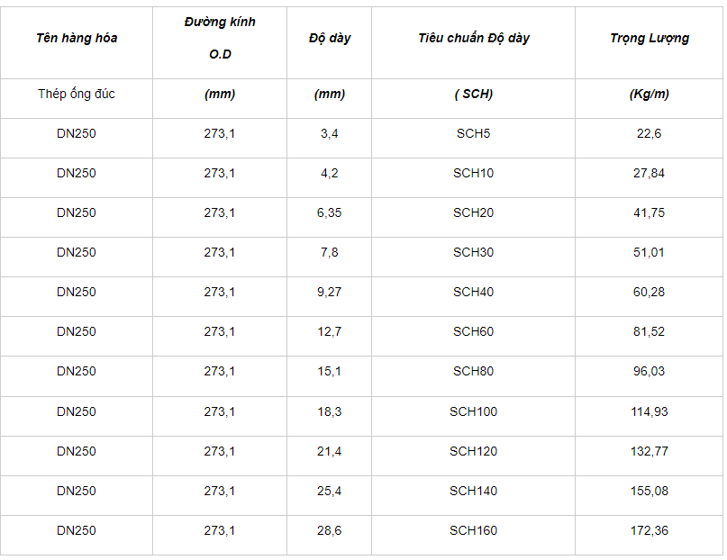 Quy cách tiêu chuẩn ống thép đúc DN250 – Phi 273mm được thể hiện dựa trên các thông số như : Đường kính (mm) , Độ dày (mm), Tiêu chuẩn độ dày (SCH), Trọng lượng theo Barem (Kg/m).