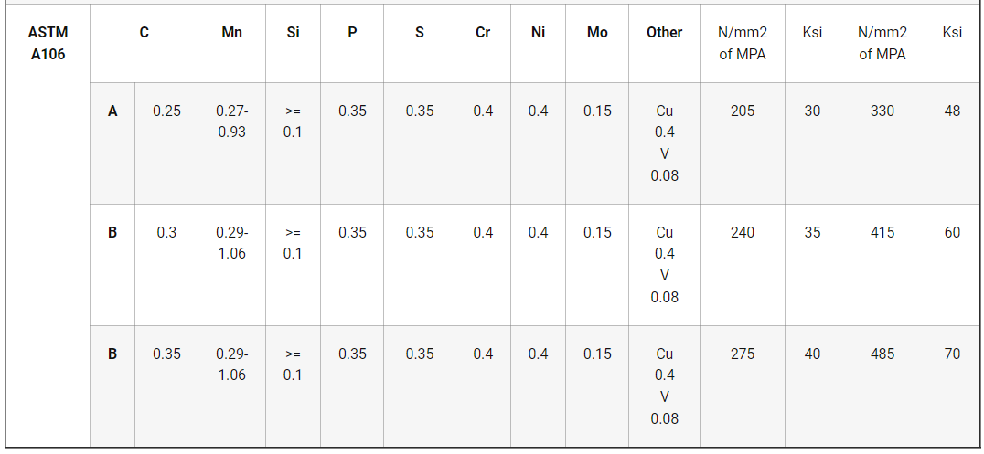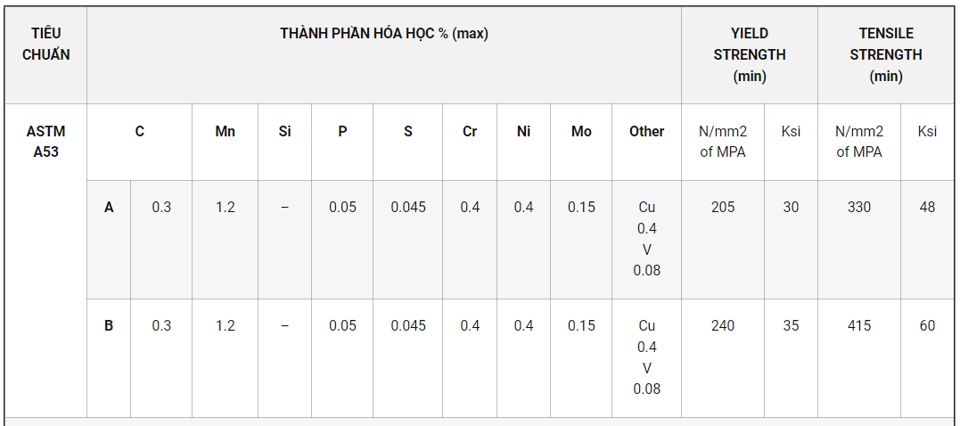 Bảng thành phần hóa học ống thép đúc DN32 theo tiêu chuẩn