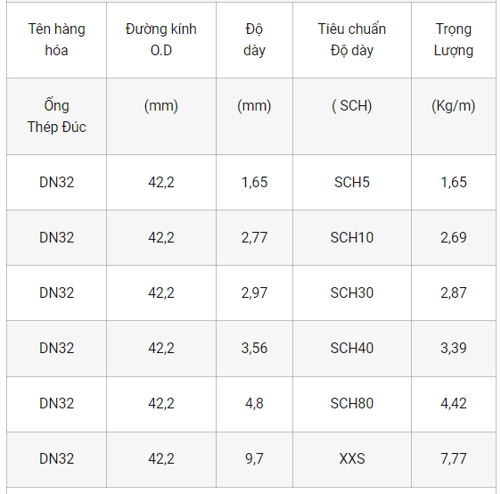 Quy cách tiêu chuẩn ống thép đúc DN32 – Phi 42.2 được thể hiện dựa trên các thông số như : Đường kính (mm) , Độ dày (mm), Tiêu chuẩn độ dày (SCH), Trọng lượng theo Barem (Kg/m).