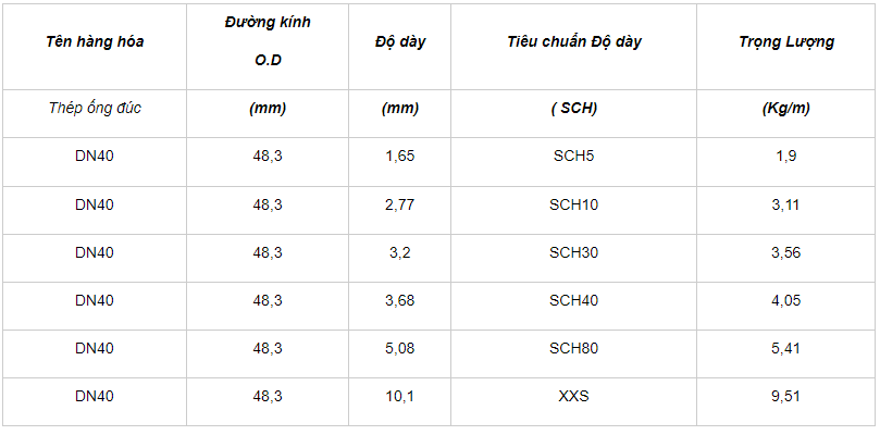 Quy cách tiêu chuẩn ống thép đúc DN40 – Phi 48.3 được thể hiện dựa trên các thông số như : Đường kính (mm) , Độ dày (mm), Tiêu chuẩn độ dày (SCH), Trọng lượng theo Barem (Kg/m).