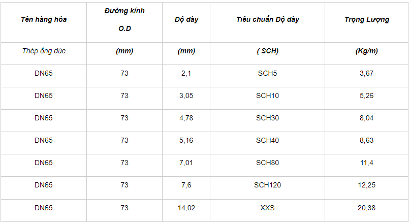 Quy cách tiêu chuẩn ống thép đúc DN65 – Phi 73mm được thể hiện dựa trên các thông số như : Đường kính (mm) , Độ dày (mm), Tiêu chuẩn độ dày (SCH), Trọng lượng theo Barem (Kg/m).