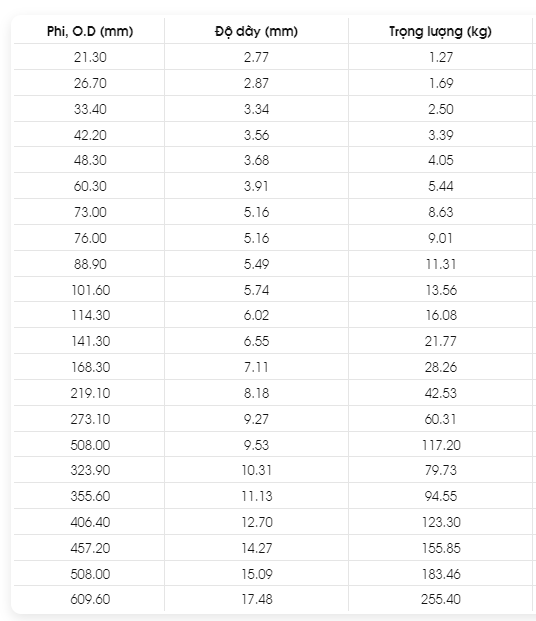 Sản phẩm ống thép đúc SCH40 được nhập khẩu và sản xuất theo tiêu chuẩn ASTM A106/A53/API 5L Gr.B với nhiều đường kính khác nhau từ DN15 đến DN600 thể hiện sau đây: