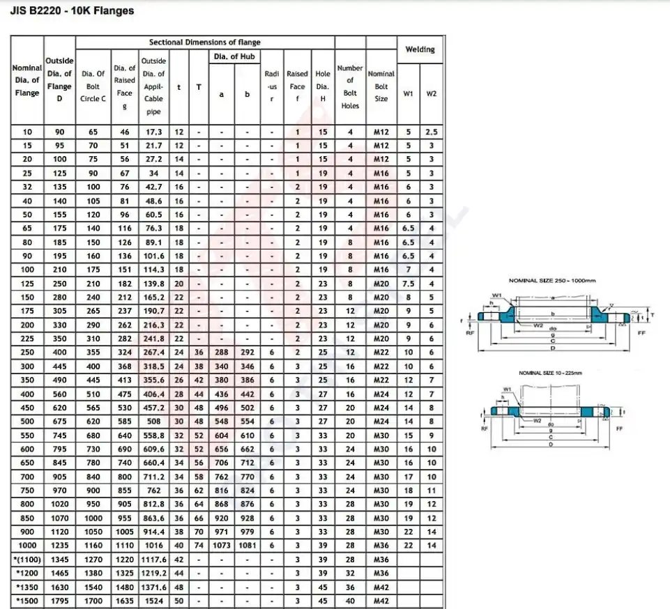 Thông số kỹ thuật mặt bích tiêu chuẩn JIS 10K