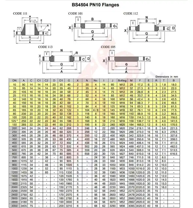 Thông số kỹ thuật mặt bích tiêu chuẩn BS4504 PN10