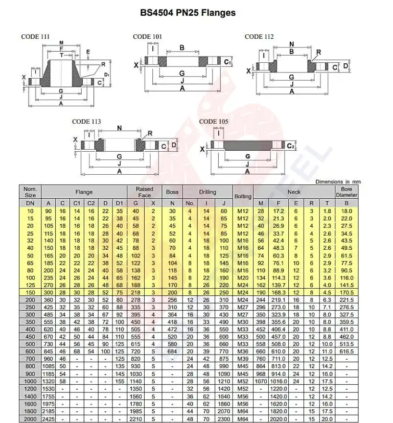 Thông số kỹ thuật bích theo chuẩn BS4504 PN25