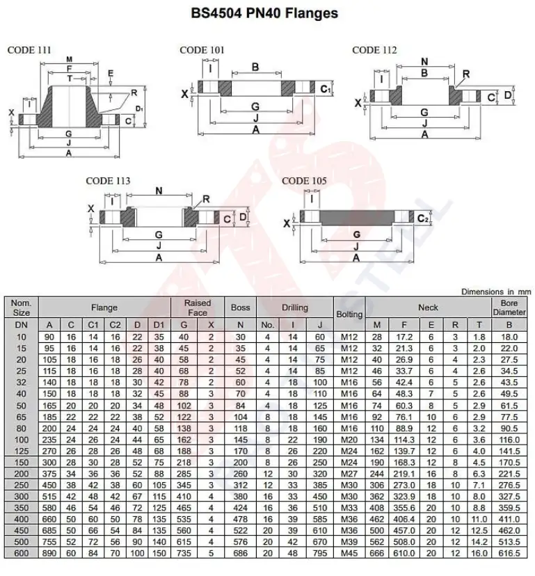 Thông số kỹ thuật bích theo chuẩn BS4504 PN40